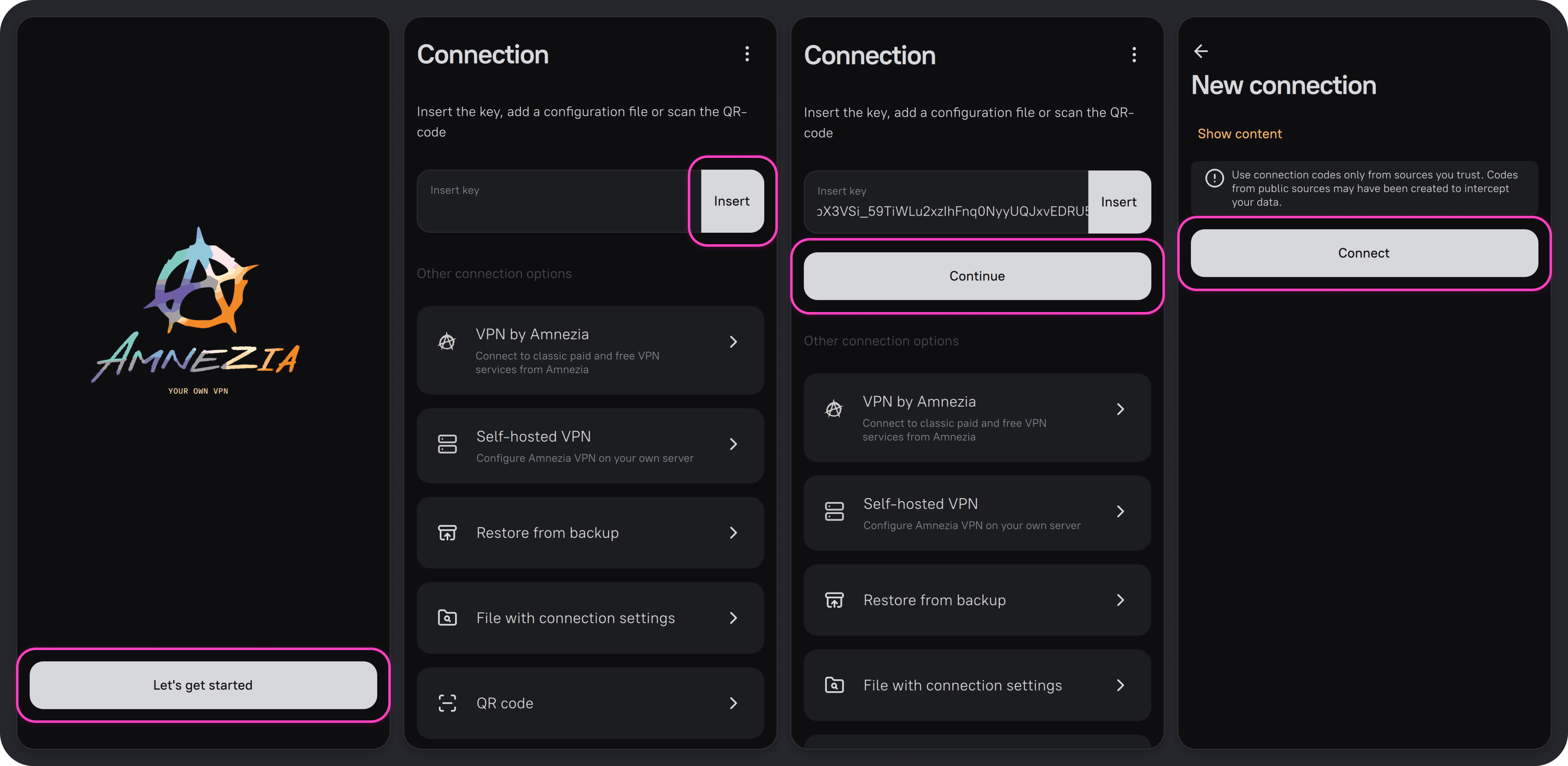 - Tap the Paste button next to the key input field → Continue → Connect.