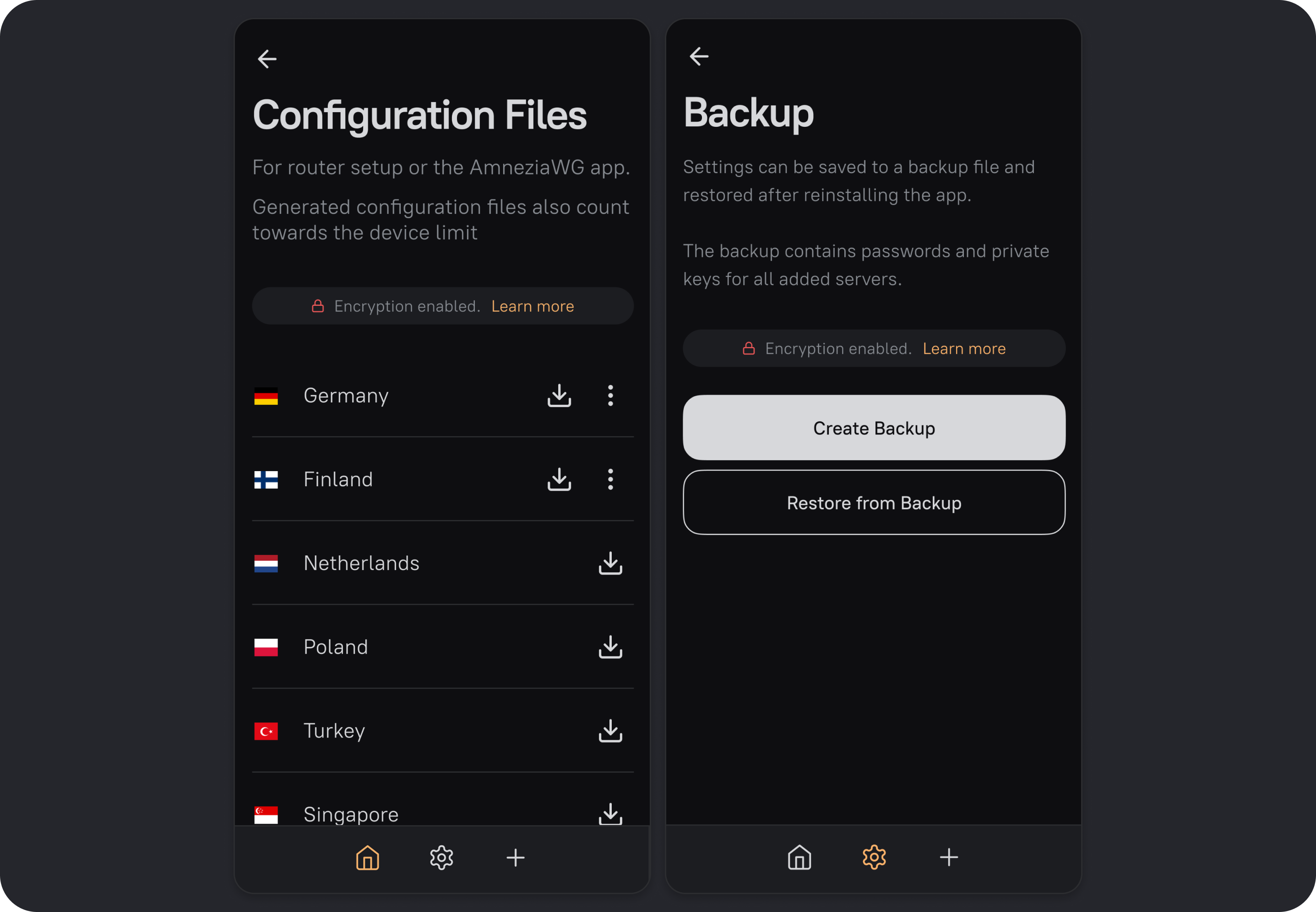 Encryption helps protect configuration and backup files from unauthorized access. For example, you can send an encrypted file to a friend so they can connect to the VPN without worrying about the file leaking online — without the password, no one can open the file in AmneziaVPN or view its contents.