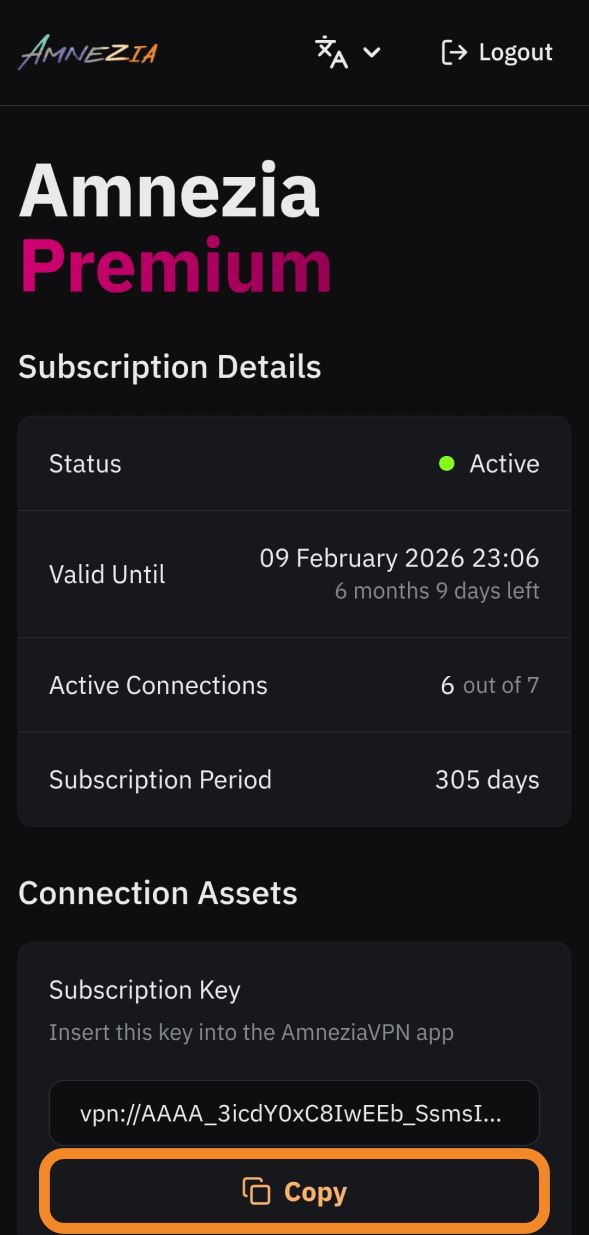 - Copy your Subscription Key vpn:// from the Personal Dashboard (mirror) or from your order email.