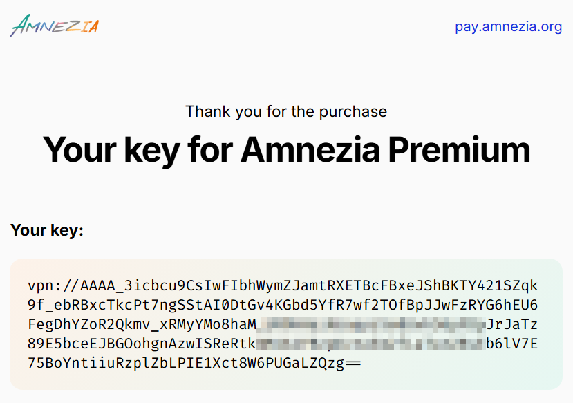 After paying for Amnezia Premium, you'll receive an email with a Subscription Key at the address you provided during payment.