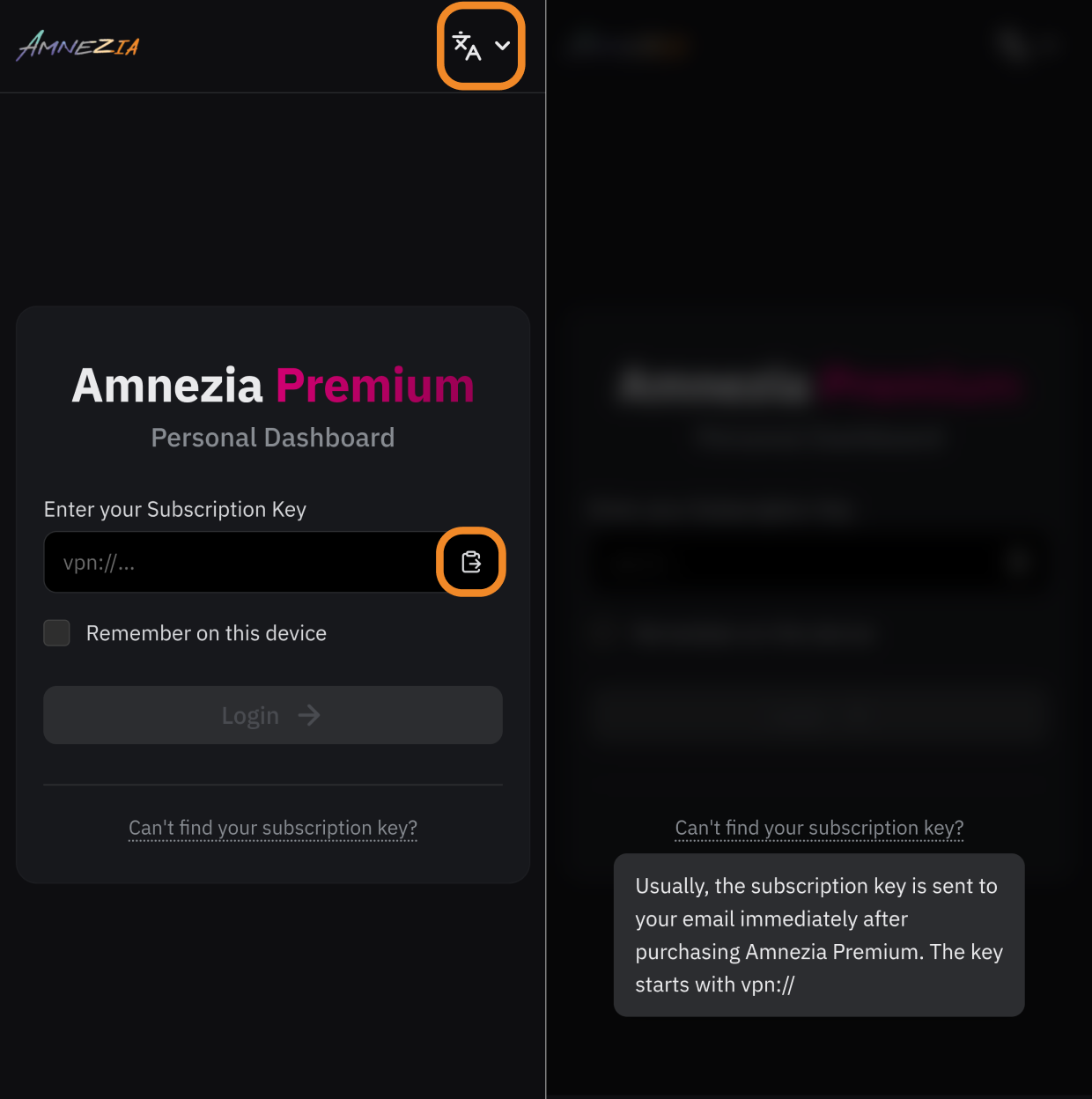 You sign in with the vpn:// Subscription Key you receive in an email after paying for Premium or getting a trial period.