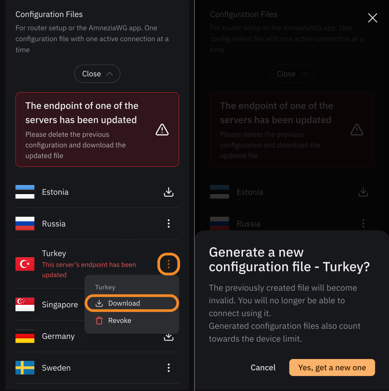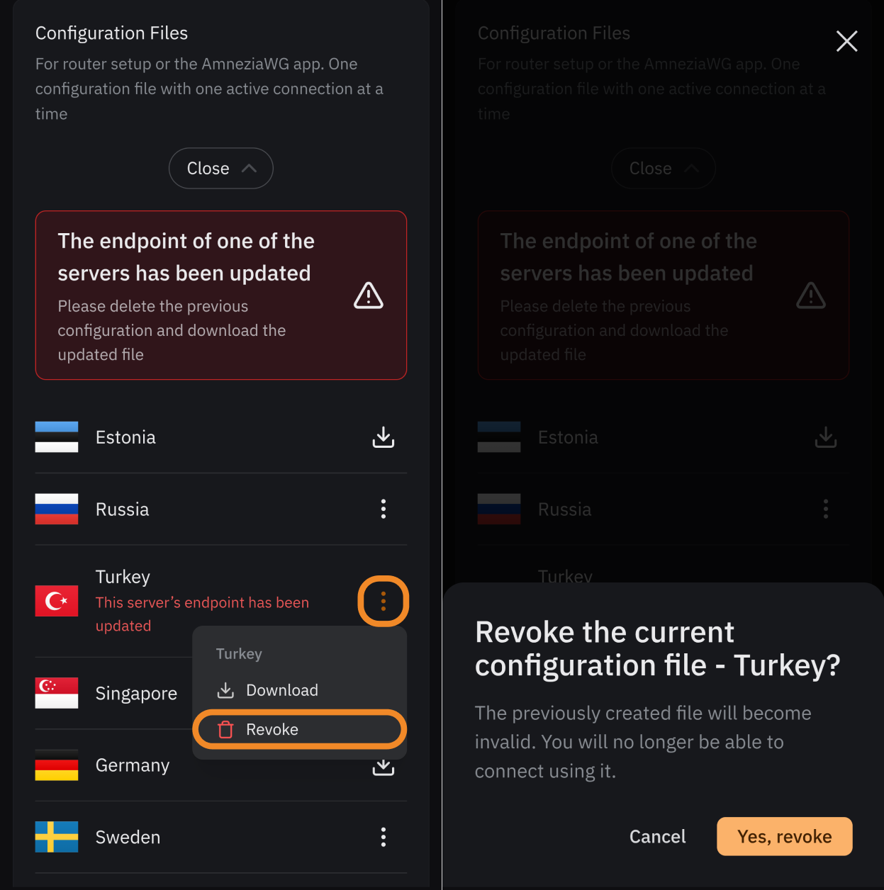 Revoke a configuration file if you don’t use it; if you need to free a slot to connect a new device via key; or if you want to revoke VPN access from someone you shared the file with.