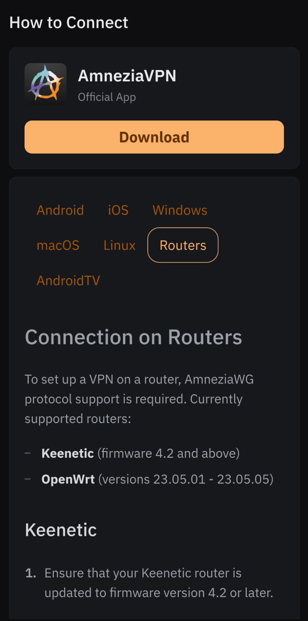 This section provides a link to download the AmneziaVPN app, as well as instructions for connecting to the VPN on all devices supported by AmneziaVPN.