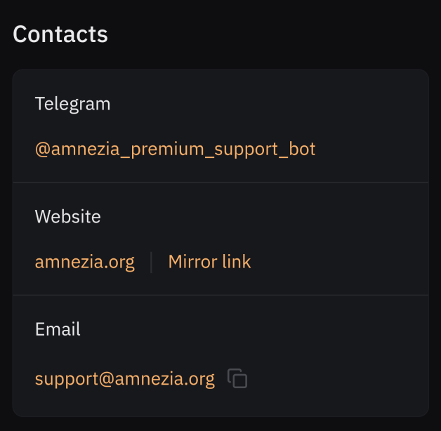 This section lists all official channels for Amnezia Premium user support: