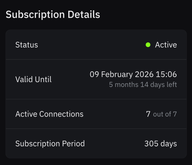 - subscription info and available connection limit;