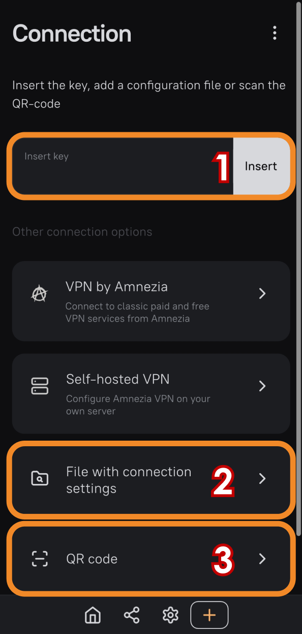 There are three ways to share the key so you can use it to connect in AmneziaVPN: