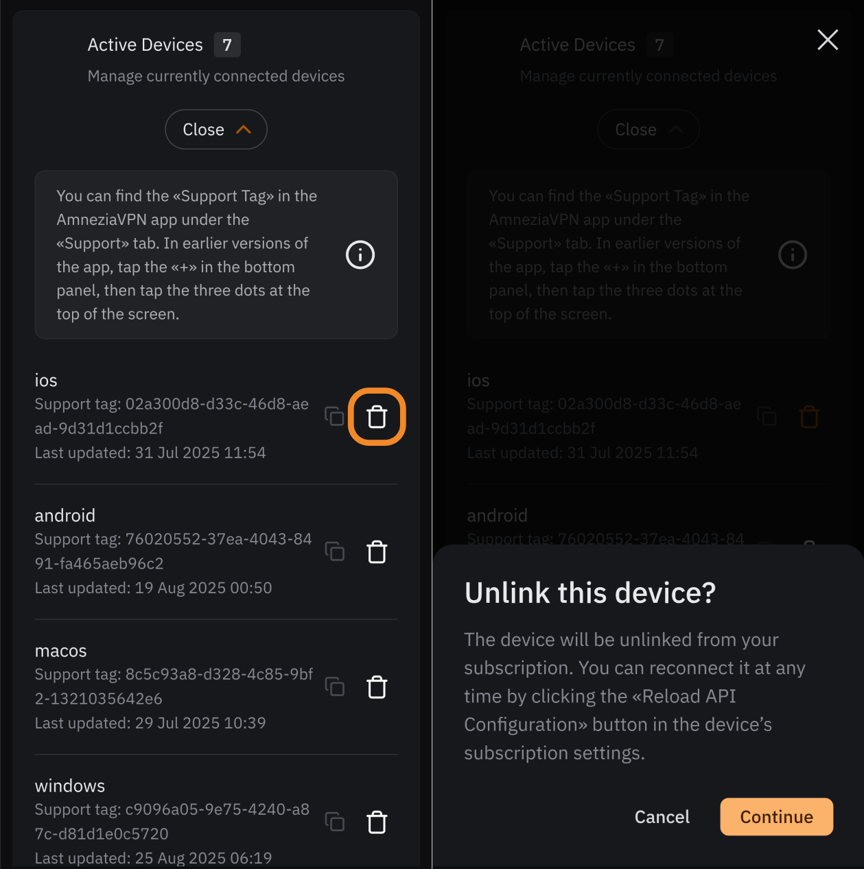 - After reinstalling AmneziaVPN on a device, the Support tag changed — the previous identifier no longer exists but still occupies an active device slot.