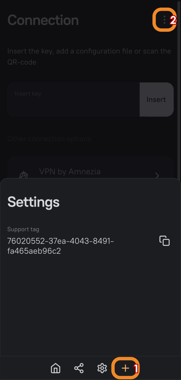 You can distinguish devices not only by OS name but also by a unique identifier called the Support tag. To show the Support tag on a device, tap ➕ (plus) on the bottom bar in AmneziaVPN → “⋮” (three dots) in the top right.