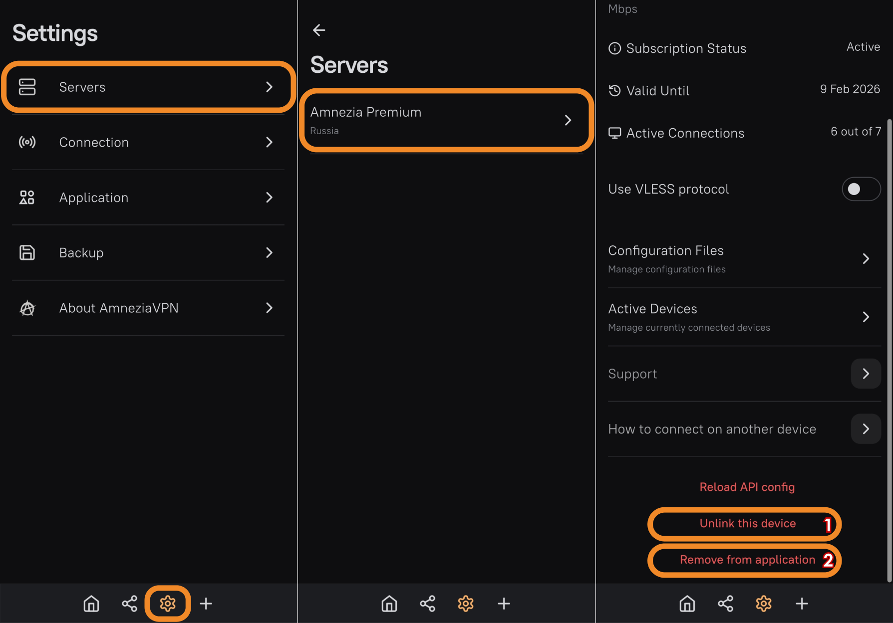 To permanently revoke access on a device, open AmneziaVPN on it → ⚙️ (gear) on the bottom bar → Servers → Amnezia Premium → Unlink this device → Remove from application.