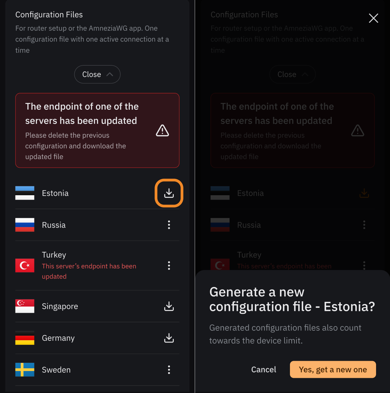 To generate a configuration file, choose your preferred location → click the 📥 icon to the right of the location name → download the file to a place where you can easily find it.