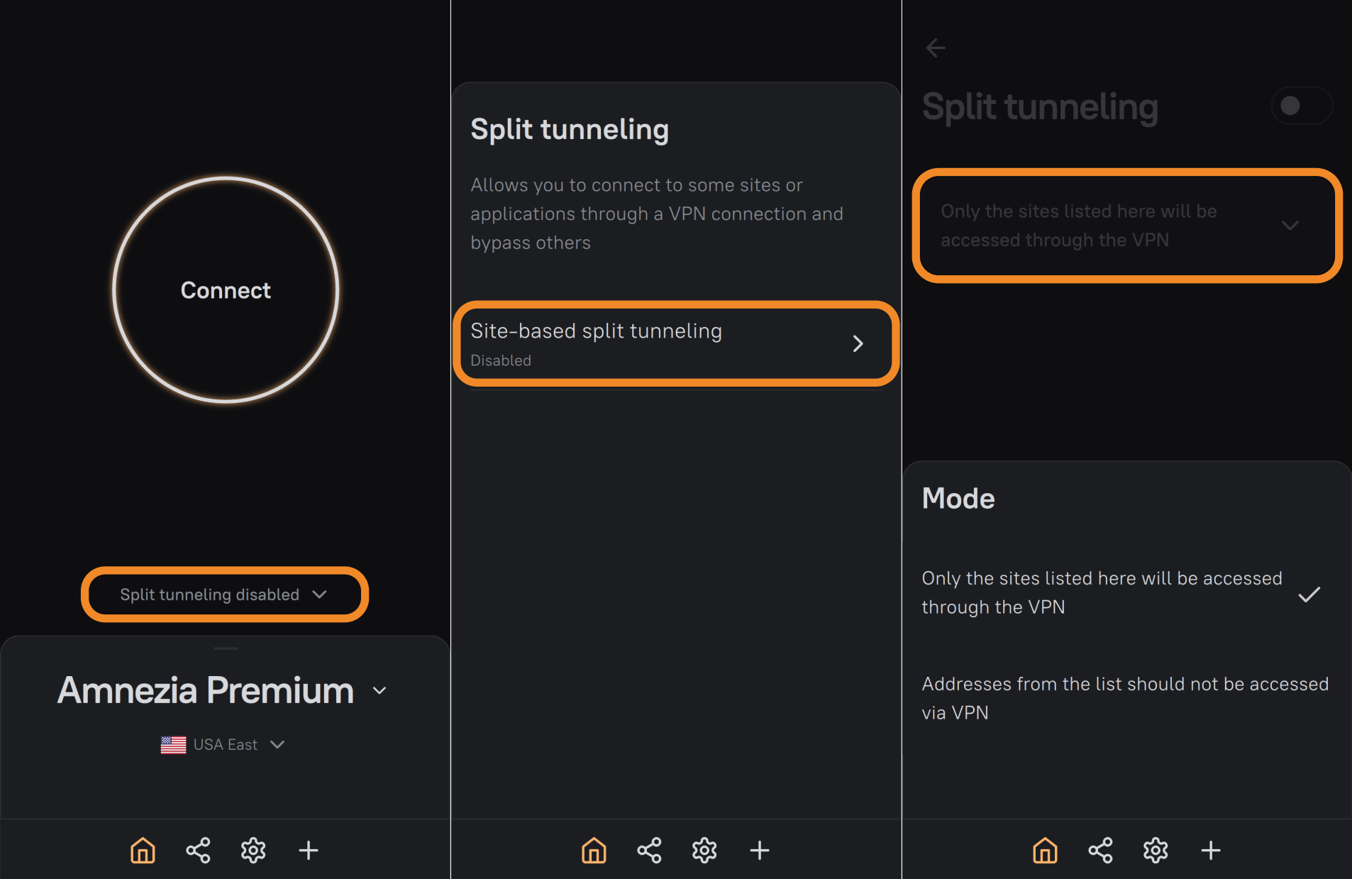 - In AmneziaVPN open split tunneling for sites and select Only the sites listed here will be accessed through the VPN.