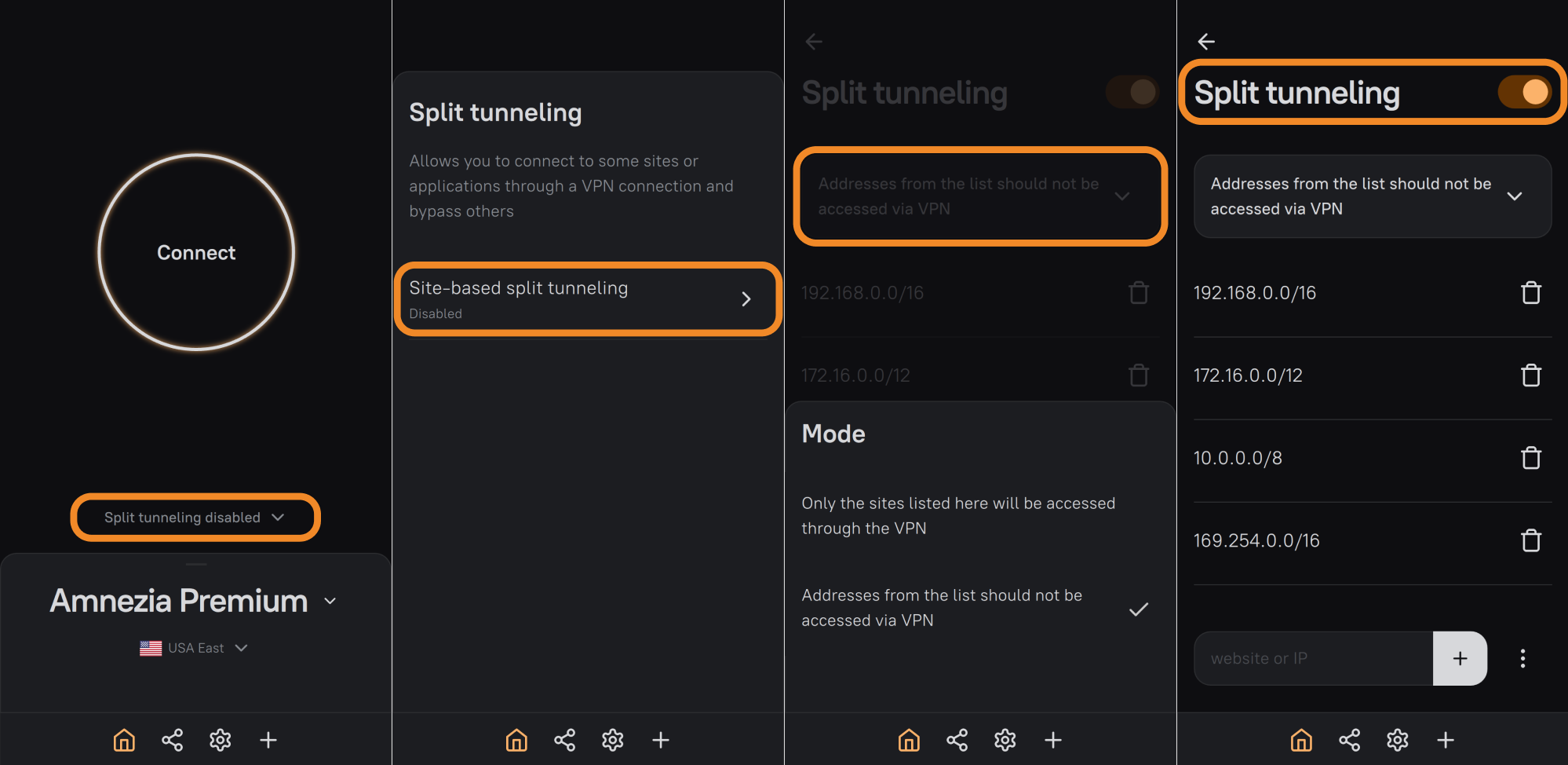 Depending on your operating system, AmneziaVPN may support both types of split tunneling (by IP addresses/subnets and by apps) or only one of them (by IP addresses/subnets). Each type usually has two modes — items from your list can go through VPN or without VPN.