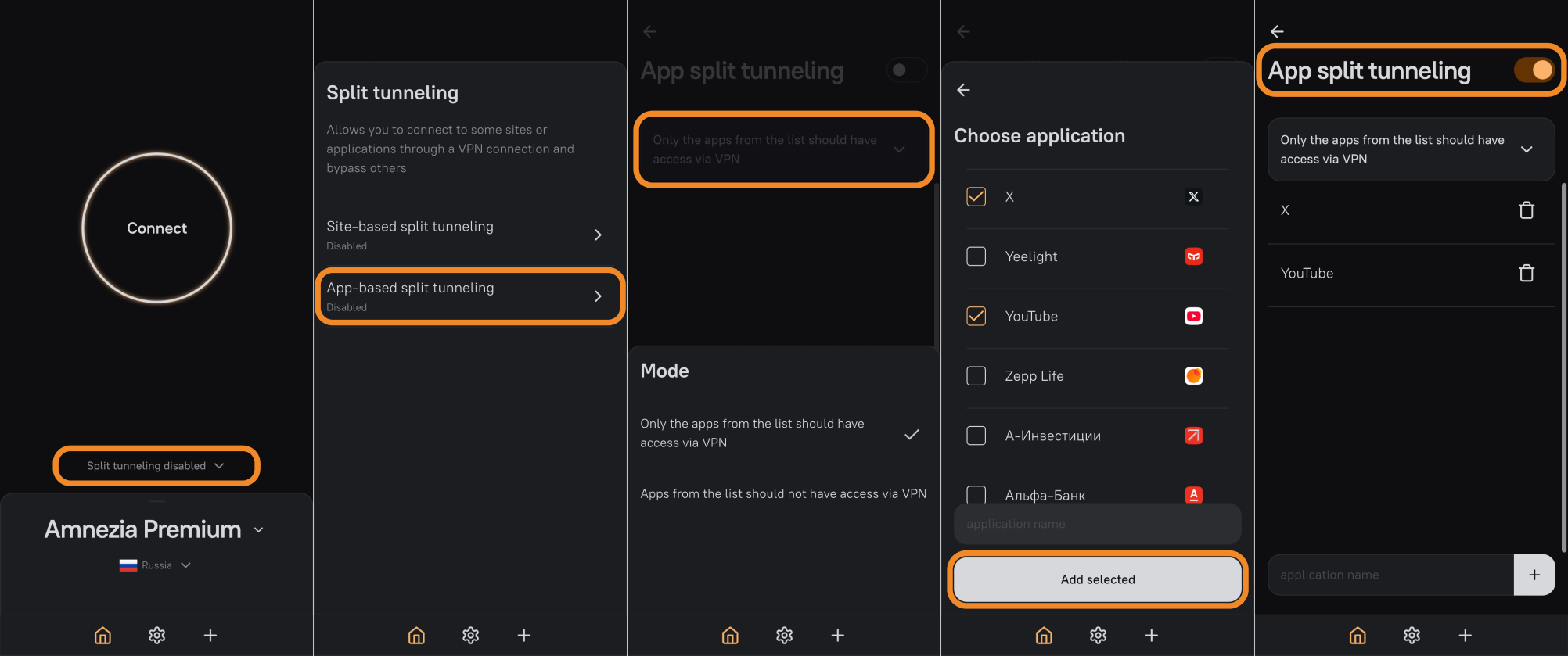 Split tunneling is an AmneziaVPN feature that lets you choose IP addresses/subnets and apps that should either use the VPN tunnel or bypass it.