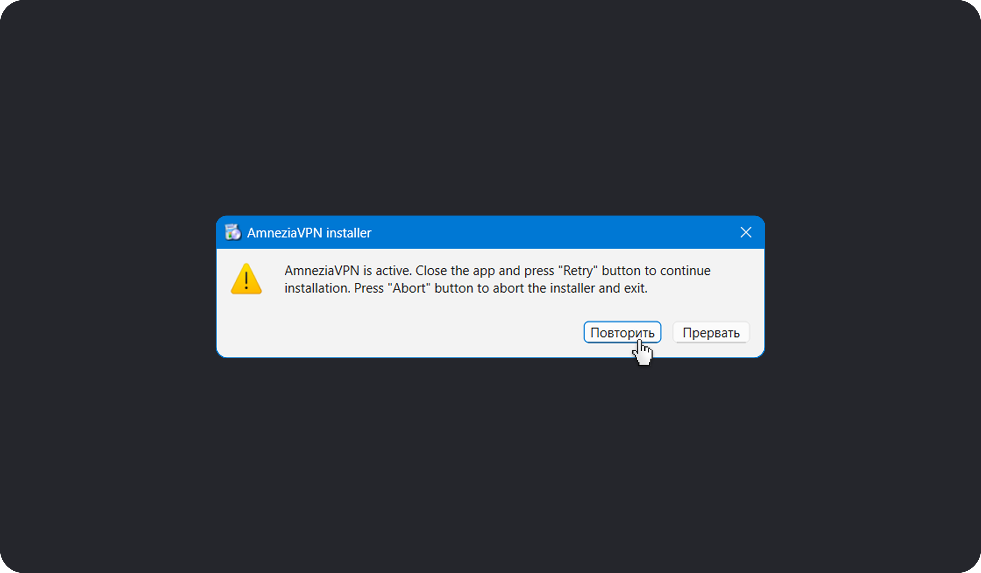 Такая ошибка возникает при открытии установочного файла .exe, если приложение AmneziaVPN не закрыто — из-за этого невозможно начать процесс его переустановки.