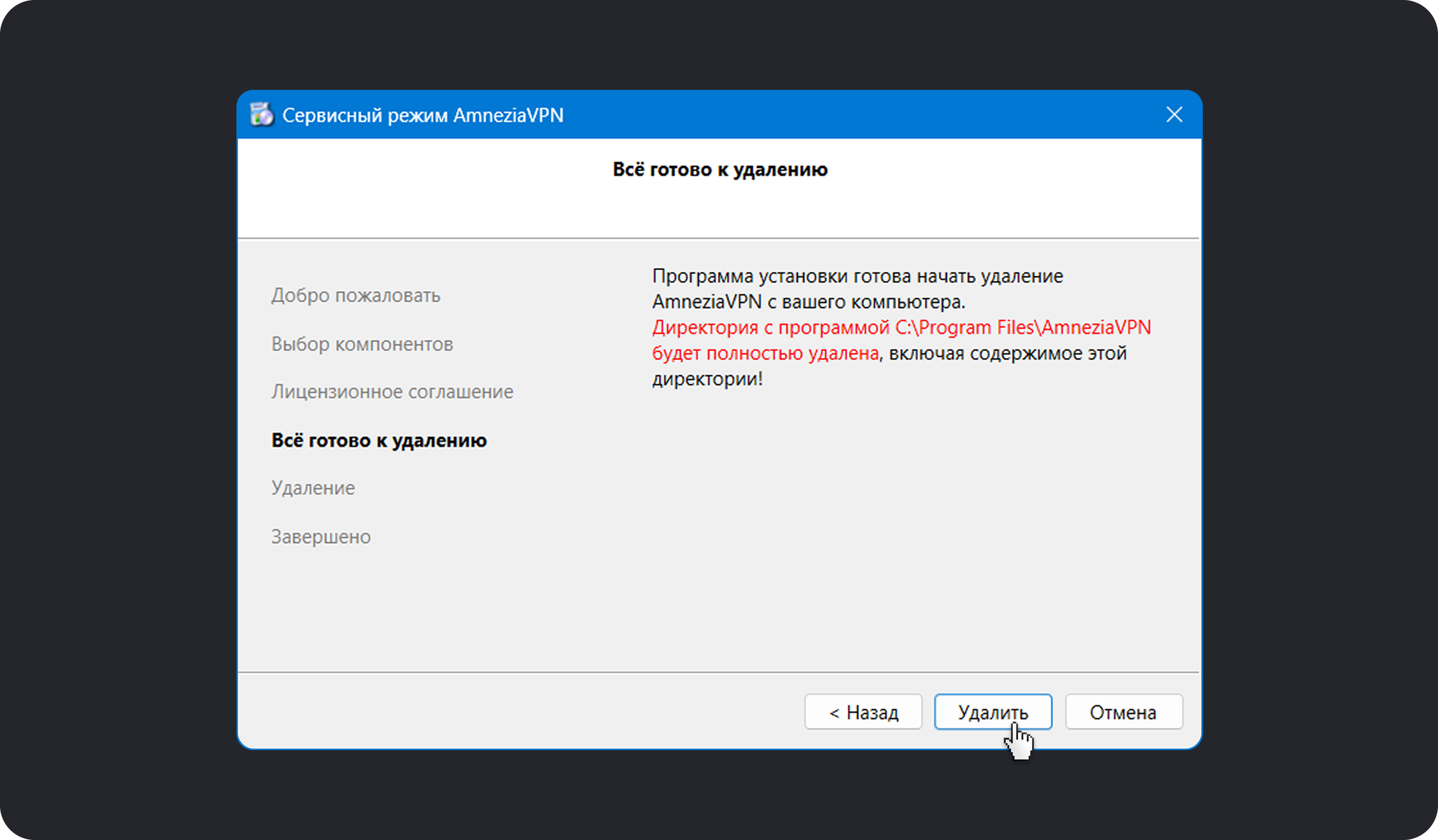 .exe, во всплывающем окне нажмите кнопку OK, чтобы перейти к процессу удаления установленной версии приложения AmneziaVPN.