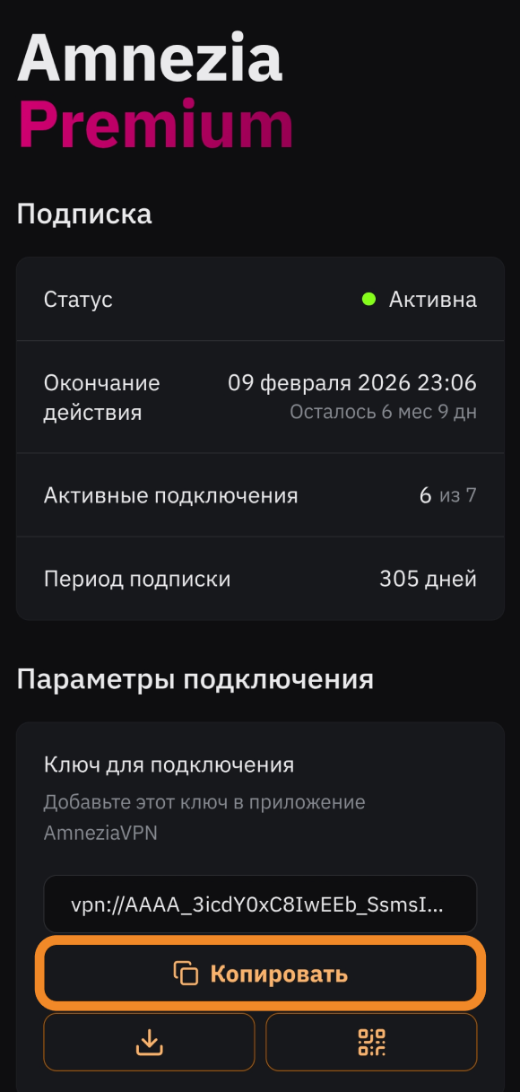 2. Скопируйте ключ vpn:// из веб-версии личного кабинета или из письма с деталями заказа, которое вы получили после оплаты Premium-подписки.