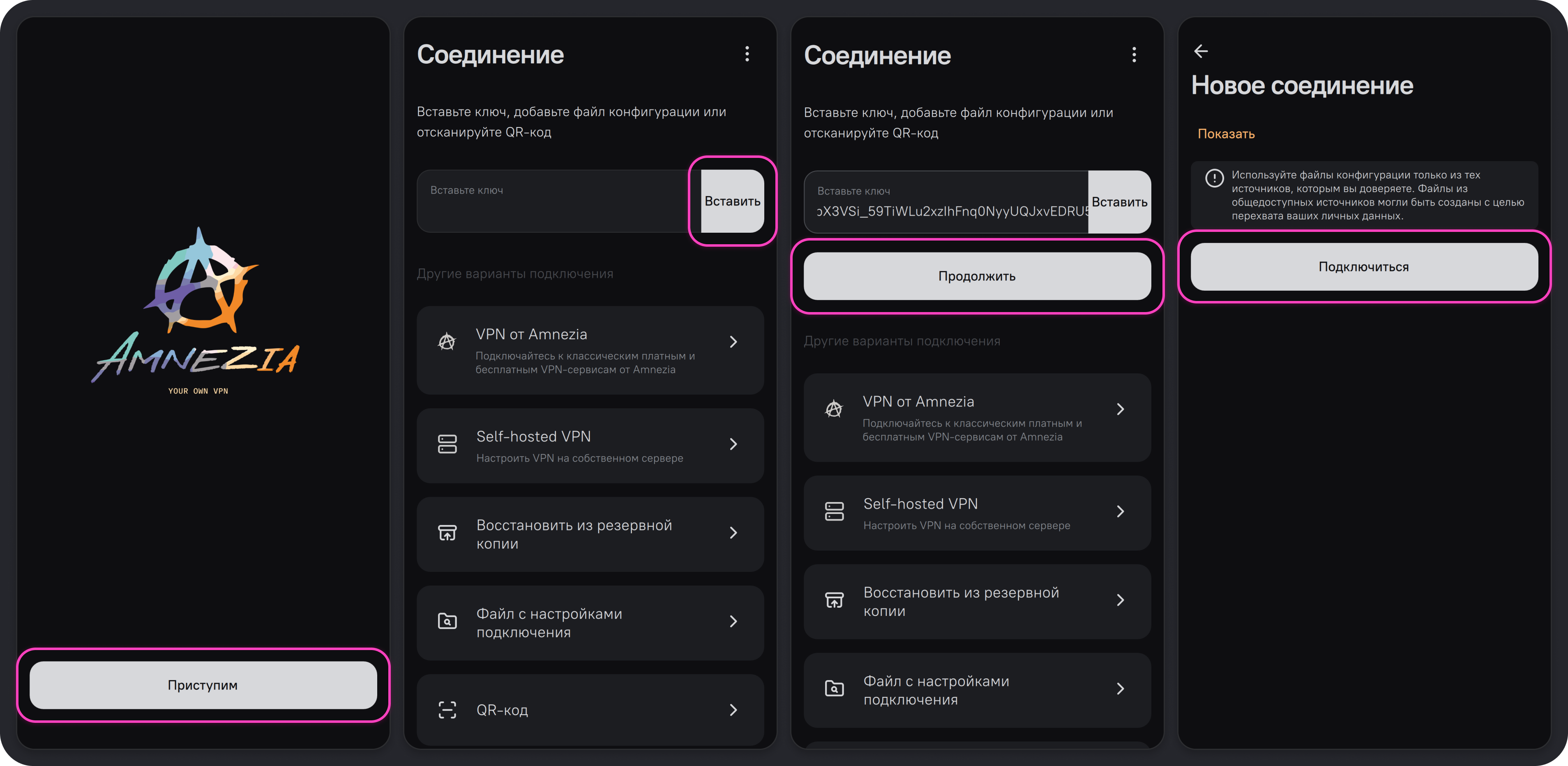 В приложении AmneziaVPN есть несколько способов создания подключения: