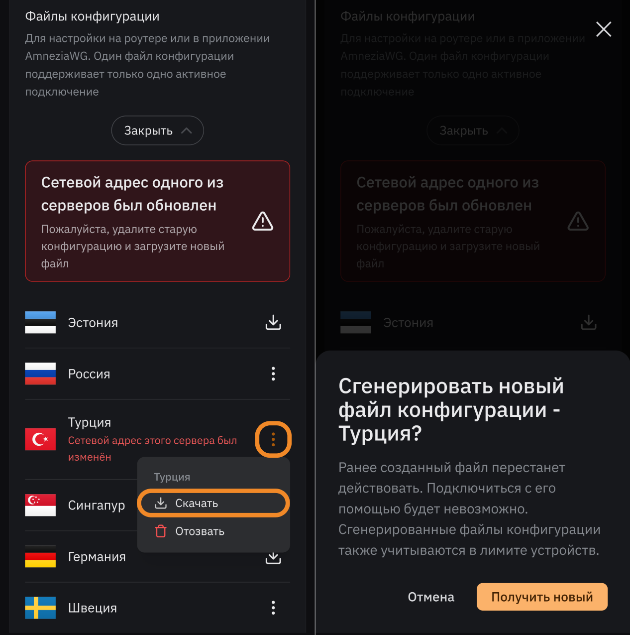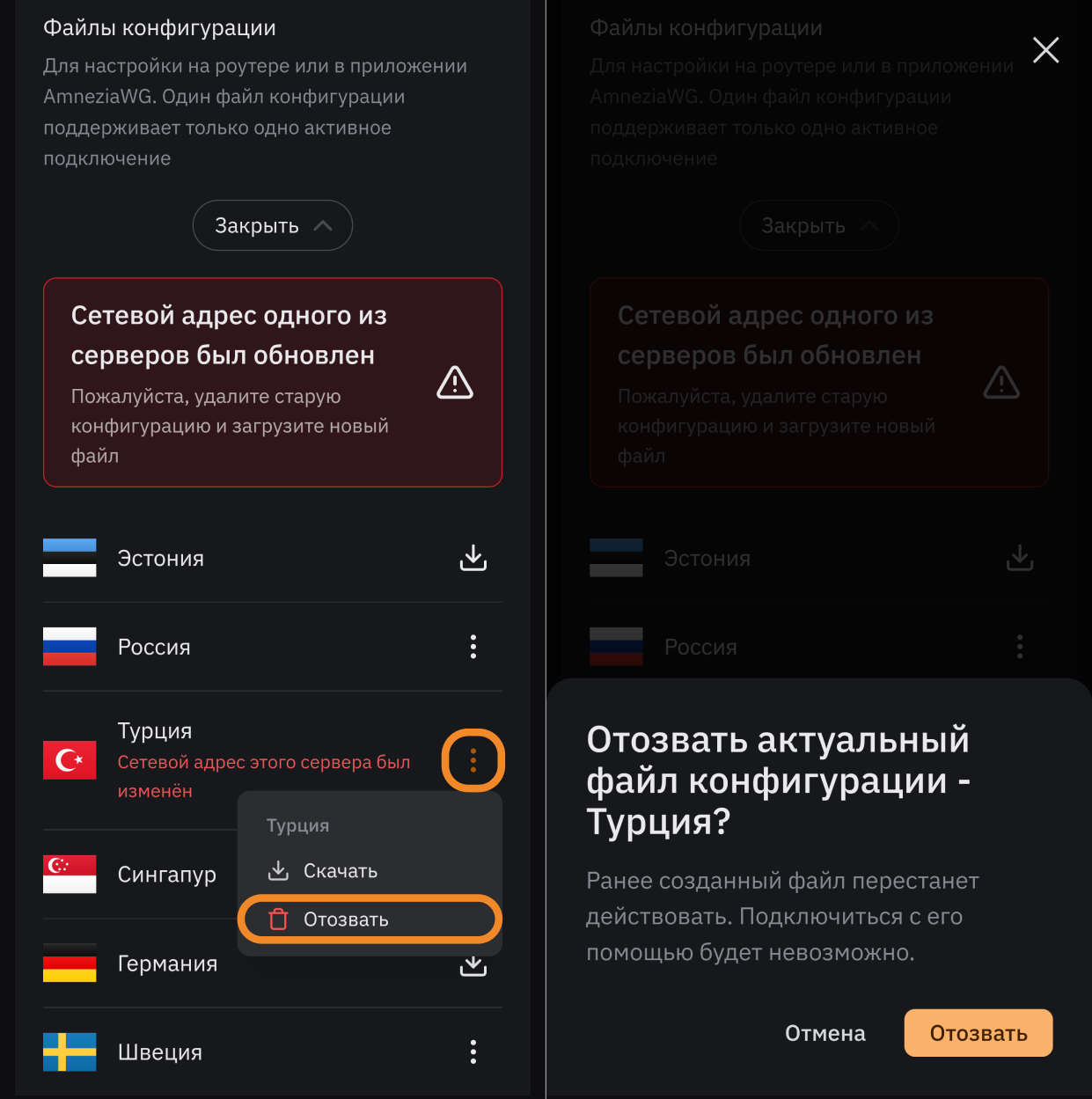 Чтобы перевыпустить или отозвать сгенерированный ранее файл конфигурации, нажмите на значок «⋮» (три точки) справа от названия локации. В этих случаях старый файл конфигурации перестанет работать в течение 24 часов.