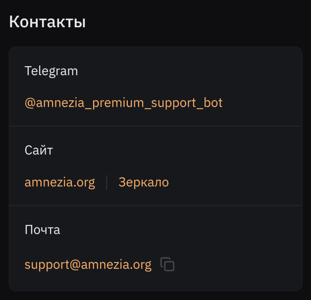 В разделе контактов указаны все официальные каналы для связи с поддержкой пользователей Amnezia Premium: