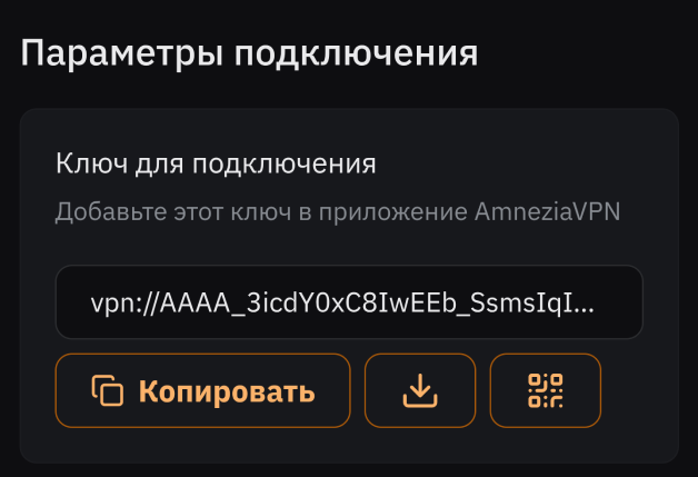 Есть три варианта, как можно поделиться ключом, чтобы использовать его для подключения в приложении AmneziaVPN: