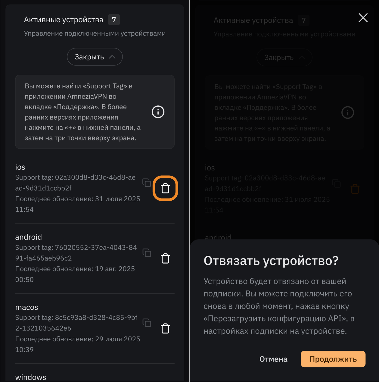 - Если после переустановки приложения AmneziaVPN на устройстве изменился Support tag — в таком случае предыдущий идентификатор перестаёт существовать, но продолжает занимать слот активных устройств.
