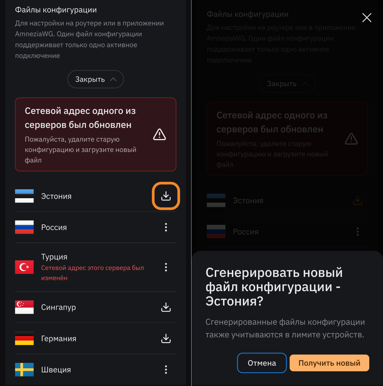 Чтобы сгенерировать файл конфигурации, выберите предпочтительную локацию подключения → нажмите на значок 📥 справа от названия локации → скачайте файл в удобное место, где вы легко сможете его найти.