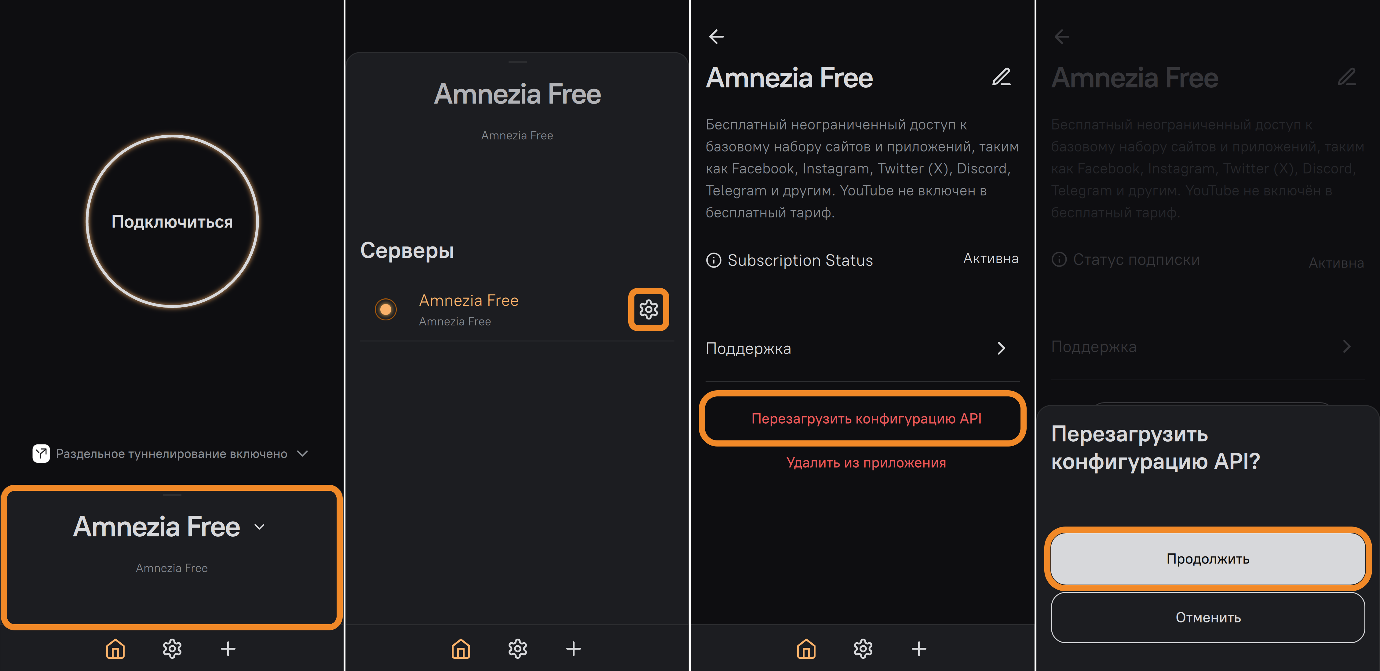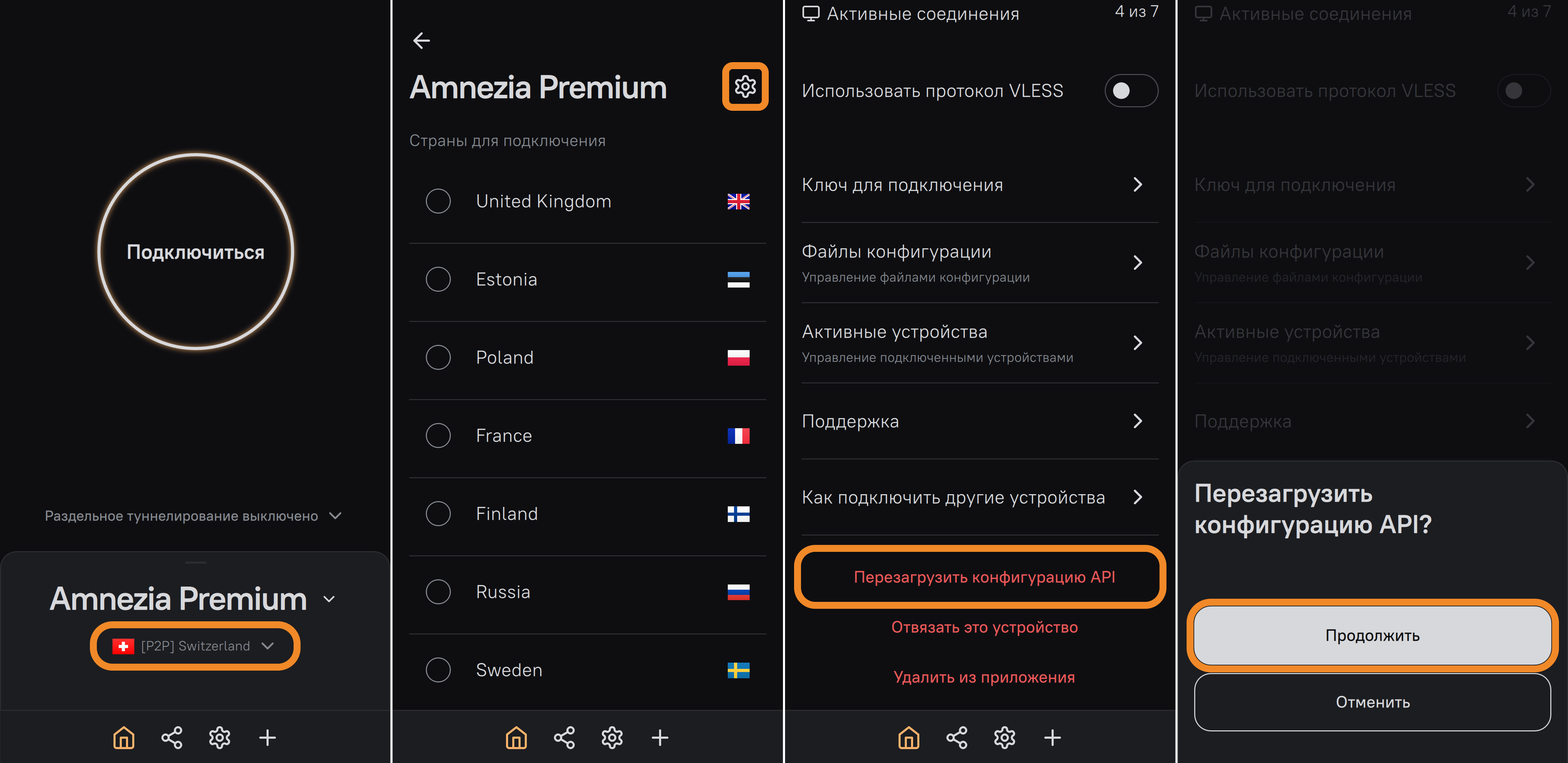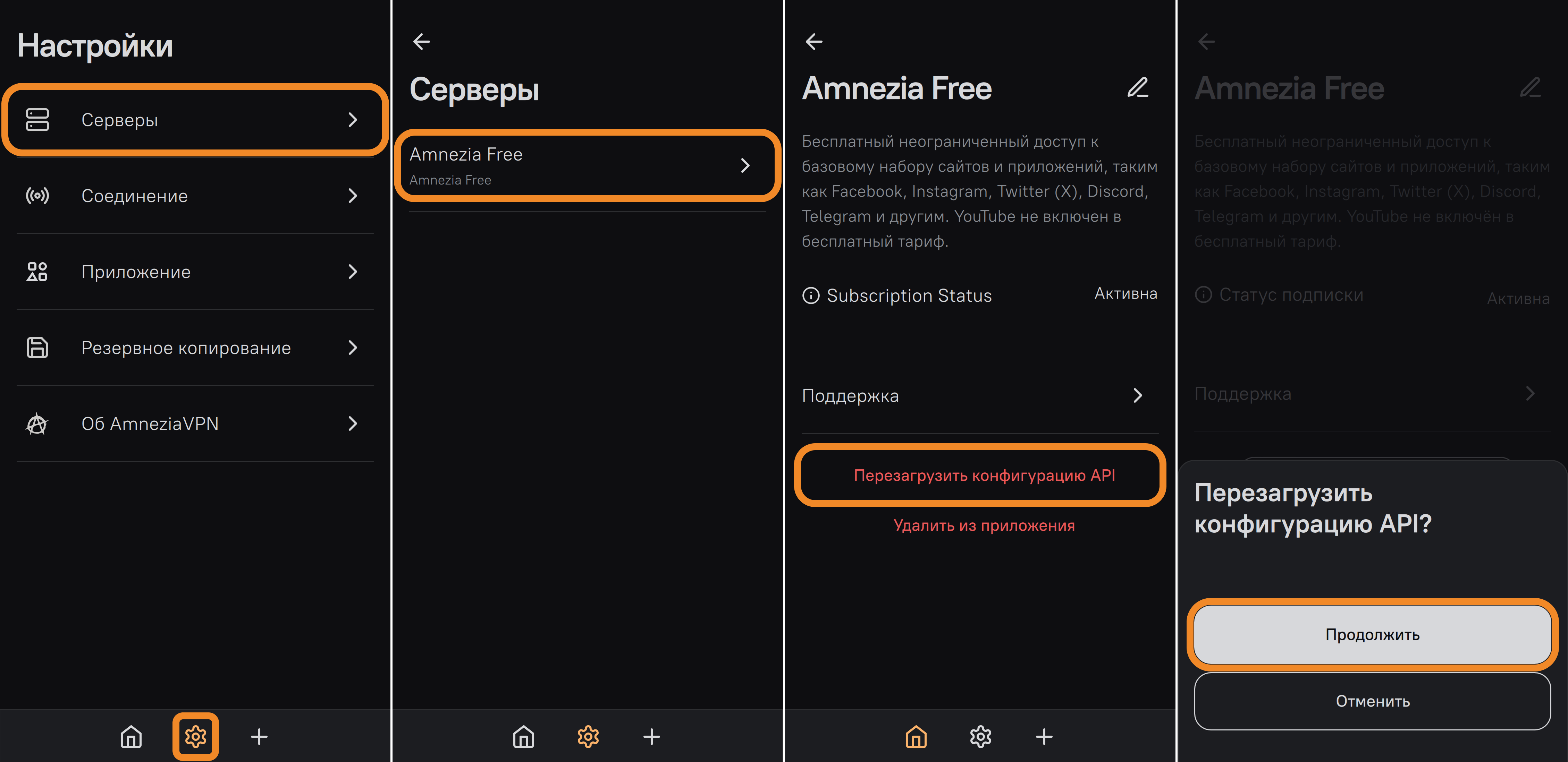 3. В открывшемся разделе настроек сначала нажмите Перезагрузить конфигурацию API, затем Продолжить.