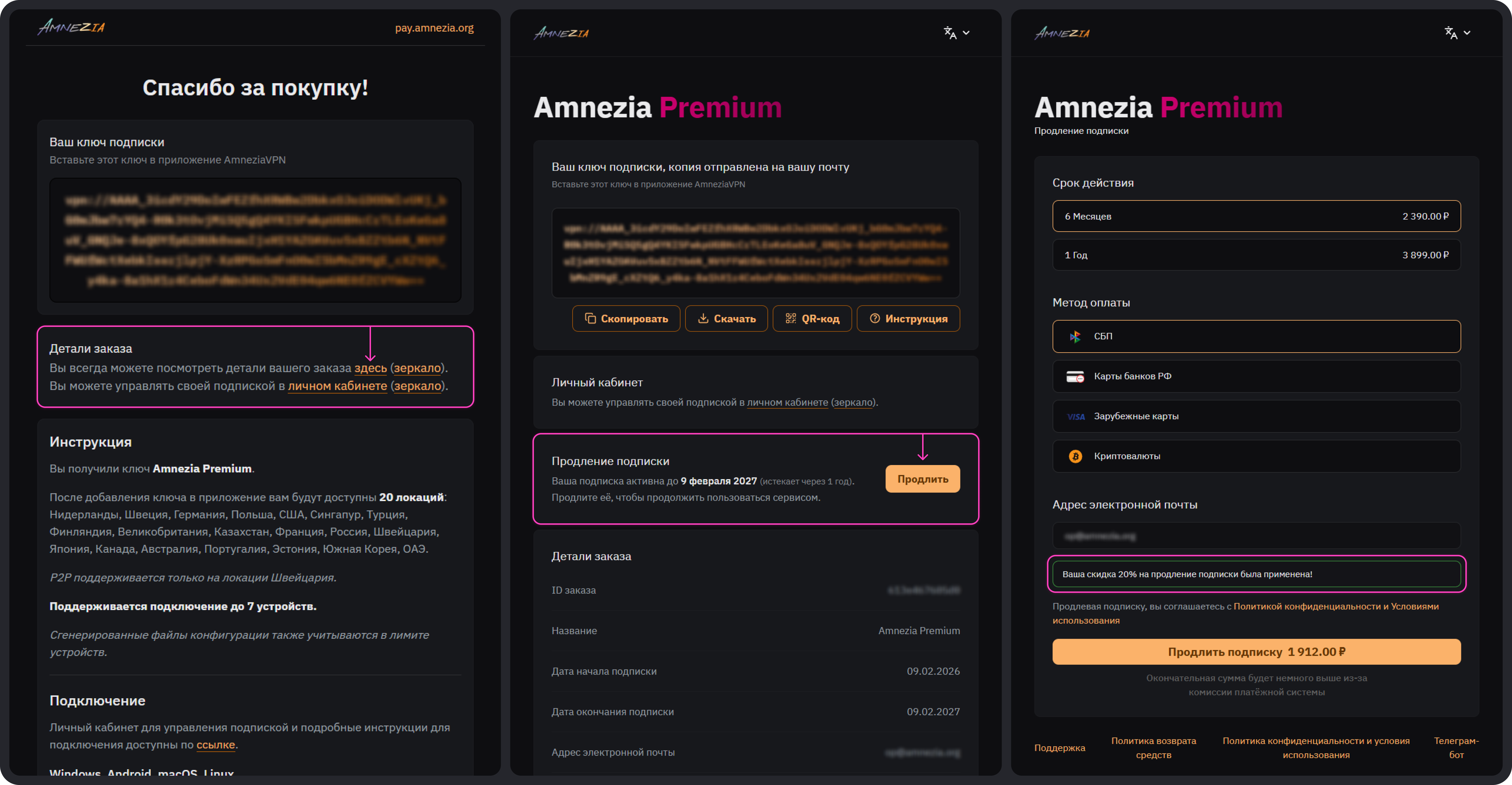 Вариант 3. Если вы оплатили Amnezia Premium 7 февраля 2026 или позже, в полученном письме с ключом подписки есть ссылка на страницу с деталями заказа — перейдите по ней.